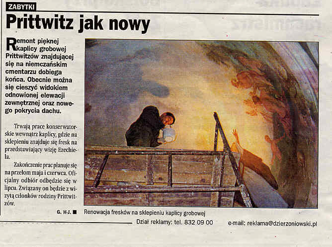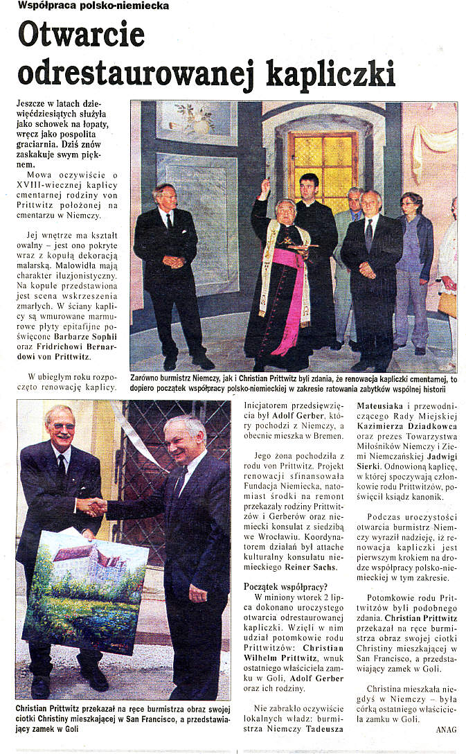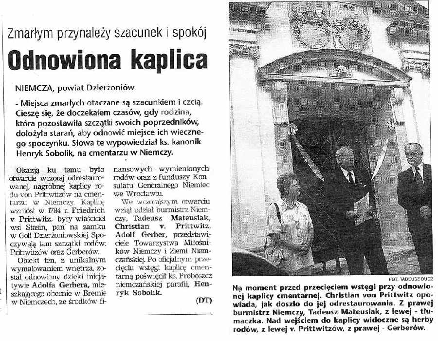 Dnia 2.07.2002 o godz. 10.00 nastąpiło uroczyste otwarcie kapliczki rodziny von Prittwitz położonej na cmentarzu w Niemczy. Kapliczka z unikalnym wymalowaniem wnętrza została odrestaurowana przez inicjatywę pana Adolfa Gerbera, pochodzącego , z Niemczy obecnie mieszkającego w Bremen (Niemcy). Środki na remont pochodzą z Niemiec. Rodzina pana Gerbera, rodzina von Prittwitz i fundusze niemieckiego Konsulatu we Wrocławiu umożliwiły ten dość kosztowny remont. W otwarciu brały udział lokalne władze miasta i gminy Niemcza i członkowie rodzin Gerber i von Prittwitz.